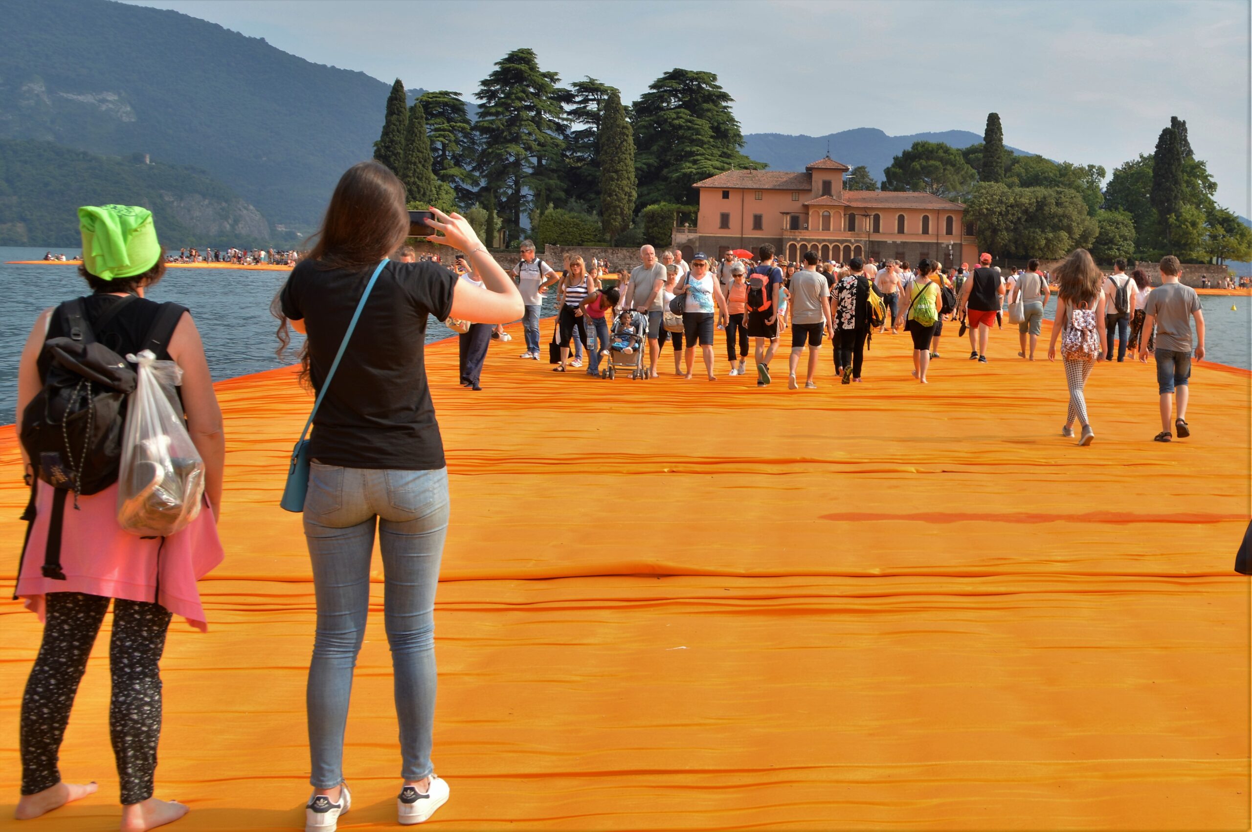 Il Floating Piers di Christo è una passerella galleggiante, un ponte, che da ai visitatori la possibilità di vivere il lago d’Iseo e la sua natura in un modo nuovo, raggiungere le isole al centro dello specchio d’acqua con le proprie gambe e i propri tempi, sdraiarsi al sole e scattare foto dalla superficie dello specchio d’acqua e non dai colli che lo cingono, sentirsi piccoli.