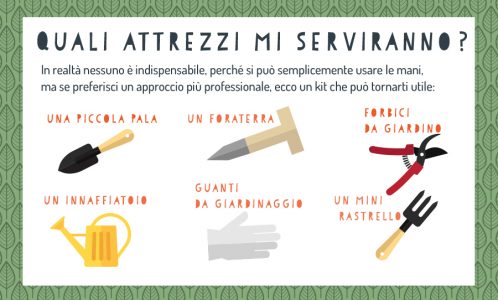 Per un primo kit da giardinaggio, nessun attrezzo è veramente necessario ma pochi accessori possono facilitare di molto la cura di ortaggi ed erbe. Una piccola pala, adatta per i vasi di medie dimensioni, sarà utile per smuovere il terriccio velocemente. Anche un foraterra può essere di aiuto, dato che permette di bucare il terreno in maniera uniforme prima di seminarlo. Indispensabili un innaffiatoio e un paio di guanti, così da progettere le mani dalla terra e da eventuali irritazioni. Da ultimo, può tornare utile un piccolo rastrello per rompere la crosta che tende a formarsi sul suolo.
