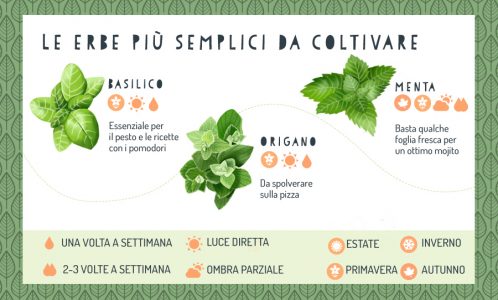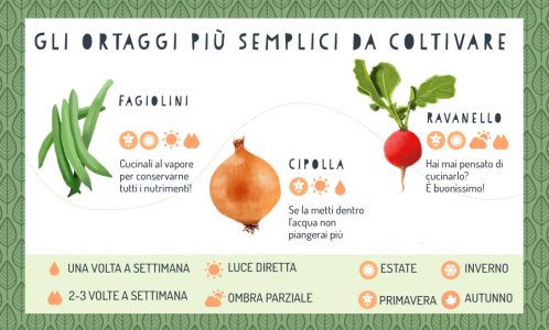 Tra gli ortaggi più semplici da coltivare c’è, ad esempio, la cipolla. Le varietà sono molte e ne esistono sia di invernali sia di estive, quindi scegliendo quella adatta è possibile piantarle in qualsiasi periodo dell’anno.  In piena primavera, da aprile a maggio, è possibile seminare i fagiolini. Sempre dalla fine dell’inverno, e per tutta l’estate, il ravanello è un altro ortaggio di facile resa.  Tra le erbe aromatiche, la menta si adatta facilmente a tutti i tipi di clima e non necessita di particolare luce.  Infine, nella tavola mediterranea non possono mancare  basilico e origano.
