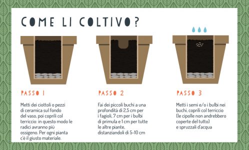 Se, avendo a disposizione solo un balcone, la coltivazione è necessariamente in vaso, qualche piccolo accorgimento vi permetterà di tenere più in salute le vostre piante. Per evitare infatti che l’acqua ristagni in vaso, è bene mettere sul fondo della fioriera qualche ciottolo, ghiaia, o pezzi di ceramica. In questo modo il terreno avrà spazio per drenare. Se si decide di partire direttamente dai semi, questi vanno piantati a circa 1 cm di profondità. I bulbi, invece, a circa 7cm, mentre i fagiolini a un paio di centimetri e mezzo. Ricordarsi di lasciare sempre spazio tra una semina e un’altra, dai 5 ai 10 cm.