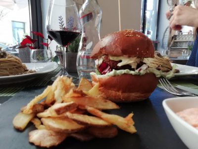 Andiamo ai primi, abbiamo scelto spaghetti integrali ai carciofi su crema di mandorle e olive di Gaeta e il “Cavoli Nostri Burger” con mopur croccante, misticanza, special maionese, coleslaw al cavolo viola e chips.