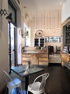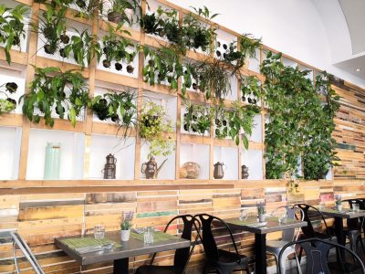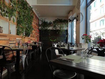 Lo stile del locale è semplice, le piante messe tipo giardino verticale arredano la parete opposta alla vetrata, in coda a una manciata ti tavolini da 2/4 persone c’è la scritta in verde “Cavoli Nostri”. Gli arredi sono del tipo minimal industriale: lampadine ad illuminare, listarelle di legno per la parete, sedie di metallo.