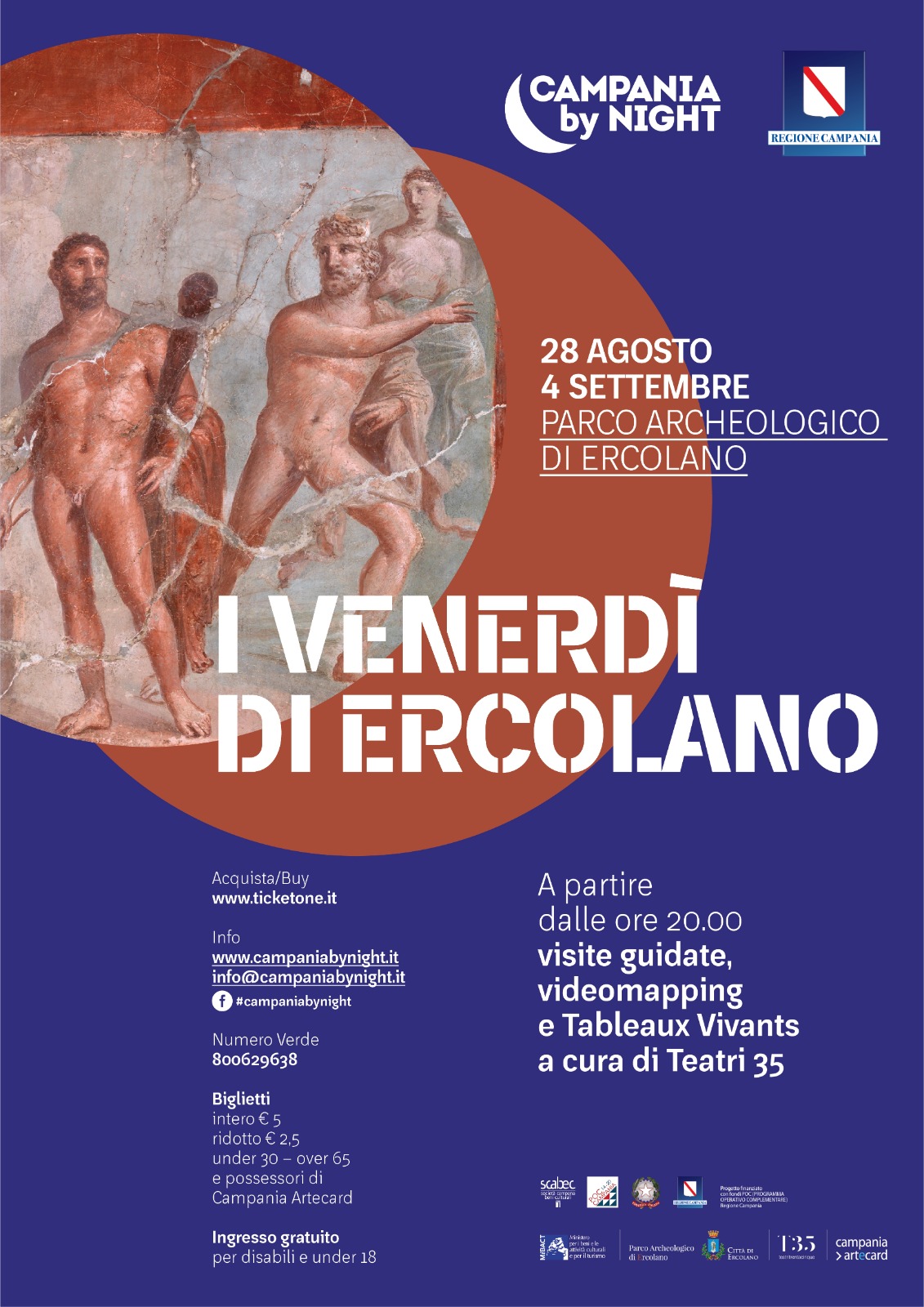 Sebbene le problematiche legate all’emergenza sanitaria per la pandemia COVID 19 non abbiano consentito di pianificare un calendario analogo a quello delle passate stagioni estive, riparte anche l’offerta serale del Parco Archeologico di Ercolano con “I Venerdì di Ercolano”, prevista nel Piano di Valorizzazione 2020 con due serate del programma Campania by night: 28 agosto e 4 settembre, realizzate dalla SCABEC Regione Campania in collaborazione con il MIBACT, il Parco Archeologico di Ercolano e il Comune di Ercolano, con percorsi accompagnati al sito, arricchiti di proiezioni di luci e riproposizioni in videomapping di alcuni dei capolavori di pittura e scultura provenienti da Ercolano a partire dagli scavi borbonici. Suggestivi “Tableaux Vivants”, a cura di Teatri 35, valorizzeranno questo percorso tra gli incanti della città antica.