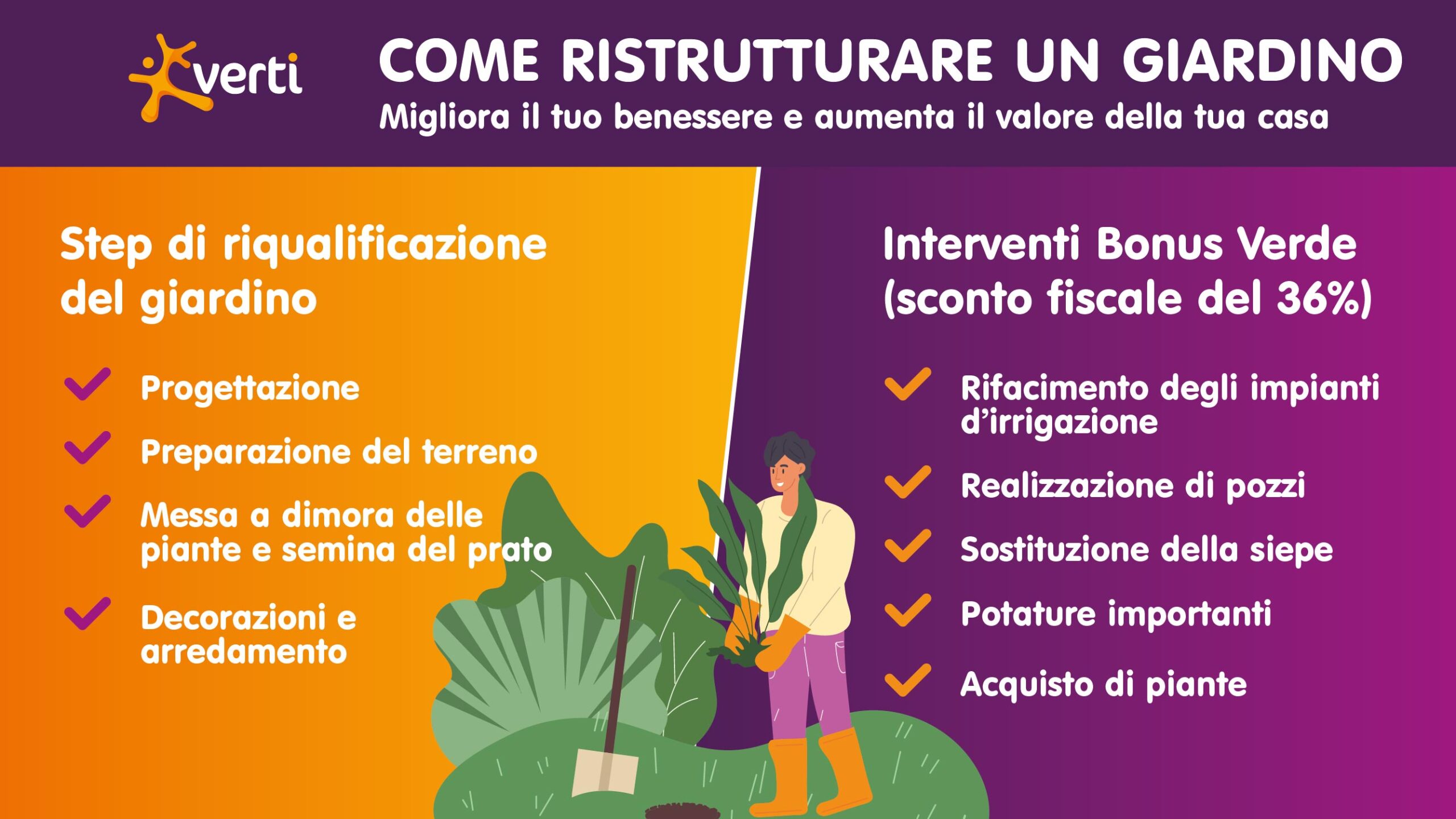 E, periodicamente, il proprietario di un giardino deve anche valutare la possibilità di ristrutturarlo. Questo è un costo sicuramente, ma c’è la possibilità di avere dei bonus, quindi degli sgravi fiscali e degli incentivi per la ristrutturazione. Il Bonus Verde, prorogato dalla Legge di Bilancio 2022, prevede uno sconto fiscale del 36% per il rifacimento degli impianti d’irrigazione, realizzazione di pozzi, sostituzione della siepe, potature importanti, acquisto di piante. Lo sgravio fiscale è suddiviso in 10 quote annuali su un limite di spesa massimo di 5.000 euro.