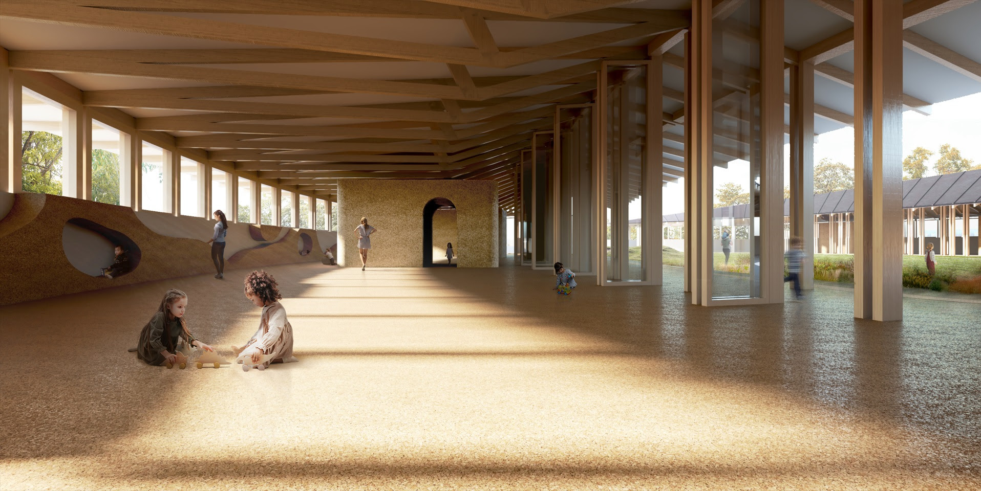 UN PADIGLIONE NEL GIARDINO Il concept propone un grande tetto a falde che circonda una corte centrale porticata che diventa il fulcro del centro infanzia, condiviso tra scuola dell’infanzia e nido. Le due scuole hanno aree di pertinenza specifiche ai lati opposti dell’ovale e sono disegnati per restare aperti alla comunità oltre l’orario scolastico. La nuova Andersen è pensata come un padiglione immerso in un nuovo giardino. Il nuovo edificio, con un impianto planimetrico circolare sviluppato intorno a una corte centrale, è allo stesso tempo intimo, perché un muro in terra cruda lo difende dall’esterno creando un recinto e pubblico perché tutti gli spazi si affacciano verso la piazza/giardino centrale. Una scansione regolare di pilastrini binati in legno e vetrate scorrevoli ritma lo spazio del portico che disegna la soluzione di continuità tra esterno ed interno. Tra i pilastrini binati si innesta una capriata rovescia che scandisce il ritmo dello spazio interno in copertura, liberandolo dalla presenza di strutture verticali e rappresentando spazialmente quella fluidità che caratterizza la società contemporanea. È il concept strutturale che dà sostanza a una scuola senza muri. La copertura a falde, in zinco, è disegnata dalle costolature della struttura e diventerà la cassa sonora per il suono della pioggia. È stato deciso di non tagliare alcuna delle alberature di pregio del lotto. Il giardino verrà disegnato da piccole differenze di quota e piantumato con orti urbani, anche ad uso della comunità.